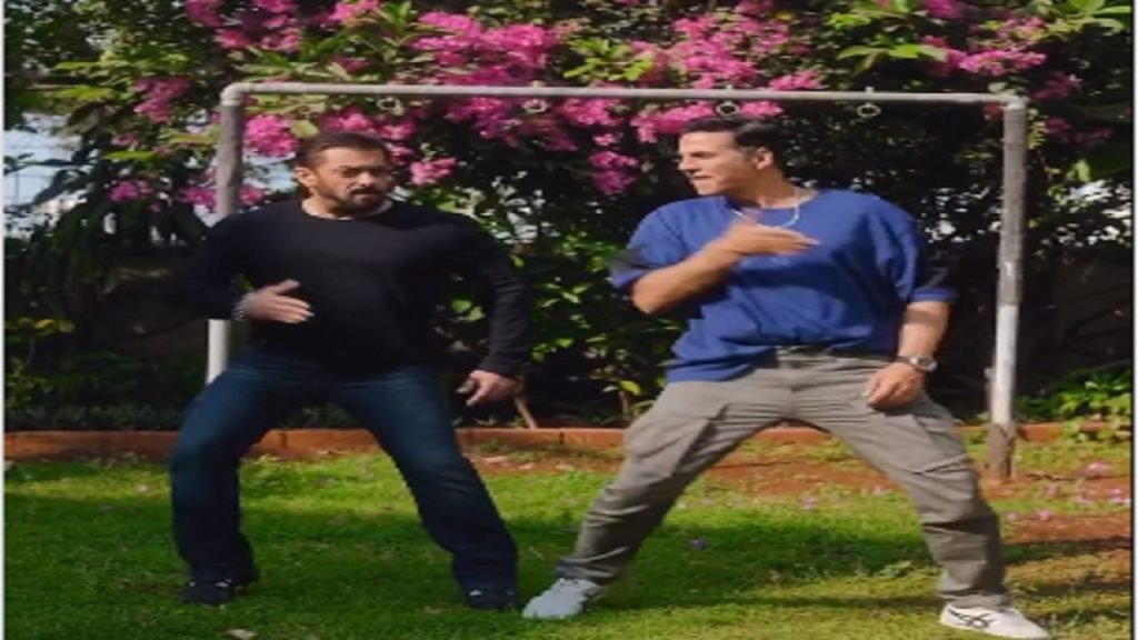 बॉलीवुड एक्टर अक्षय कुमार और सलमान खान का एक वीडियो सामने आया है, जिसमें दोनों अपकमिंग फिल्म ‘सेल्फी’ के सॉन्ग ‘मैं खिलाड़ी’ पर डांस करते हुए नजर आ रहे हैं। दोनों सुपरस्टार्स को एक साथ देखना उनके फैंस के लिए एक विजुअल ट्रीट है। इस दौरान सलमान ब्लैक टी-शर्ट और ब्लू जींस में नजर आए। वहीं अक्षय ने ब्लू टी-शर्ट के साथ ग्रे पैंट और व्हाइट स्नीकर्स में दिखाई दिए।